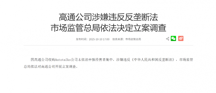国家市场监管总局公告 海报新闻首席记者 陈家伟报道 据国家市场监管总局消息,高通公司在获得Autotalks时未依法申报经营者集中,涉嫌违反《中华人民共和国反垄断法》。国家市场监管总局已依法对高通公司立案调查。海报新闻(HAibaoNewSSW)记者注意到,Autotalks是一家总部位于以色列的半导体公司,成立于2008年。这是第一家推出首款专注于V2X的芯片组,支持DSRC(专用短程通信)和C-V2X(蜂窝车联网)V2x标准。可实现车辆之间、车辆与基础设施、车辆与行人之间毫秒级低时延的通信。被业界认为是自动驾驶的一大支撑驾驶和安全冗余。 2023年5月8日,Qualcomm Technologies首次披露了获得AutoTalks的最终协议。当时市场升值高达3.5亿美元至4亿美元。由于涉及汽车通信安全、无线频谱使用、与行业标准竞争等敏感领域,该交易吸引了欧盟、英国、美国等众多监管机构的关注。 2024年3月,美国联邦贸易委员会(FTC)曾表示担心此次收购可能削弱V2X芯片市场的竞争活力。高通于2024年3月底宣布结束其首个收购计划。经过约一年的谈判和计划调整,双方最终于2025年6月5日再次完成交易。市场有评论认为,拿下公司高通是汽车业务布局的关键。高通目前在车联网芯片领域全面深入布局,主要打造了骁龙数字底盘,涵盖智能座舱、驾驶辅助、车联网等主要领域。其中,智能座舱芯片是消费者最为关注的,也一直是部分消费者购买车辆的比较关键指标之一。目前,高通已经在主流、中端、豪华三大细分市场建立了座舱布局。其推出的芯片包括骁龙8155芯片、8295芯片以及骁龙至尊版的座舱平台(骁龙8397)。值得一提的是,小米Yu7今年首次将高通骁龙8代三代芯片搬到了汽车上,引起了较大争议。相关公告显示,国家市场监管总局依法对高通展开调查,主要是因为曲alcomm在获得autotalks时未能依法表示经营集中。新闻记者注意到,《中华人民共和国反垄断法》规定经营者集中具体包括三种情况:(一)经营者整合; (二)经营者通过股权或者资产取得对其他经营者的控制权; (三)经营者通过合同或者其他方式控制其他经营者或者能够影响其他经营者。 《中华人民共和国反垄断法》第二十六条规定:经营者集中达到国务院规定的报告标准的,经营者必须提前向国务院反垄断执法机构集中,不实施集中的。新闻记者注意到,这并不是高通第一次在中国受到反垄断调查。 2015年,国家发展改革委rm委指出,高通在通常必要专利许可方面滥用支配地位,被处罚60.88亿元,并要求高通调整许可方式。